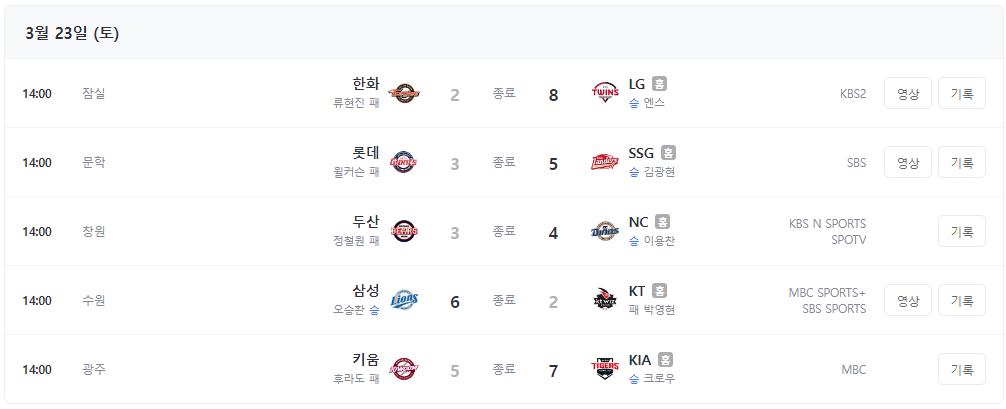 - KT 위즈 - 삼성 라이온즈: 작년 2위 KT와 8위 삼성이지만 올해 달라진 모습이 예상되는 삼성이 어떻게 경기할지 더 살펴봐야겠네요